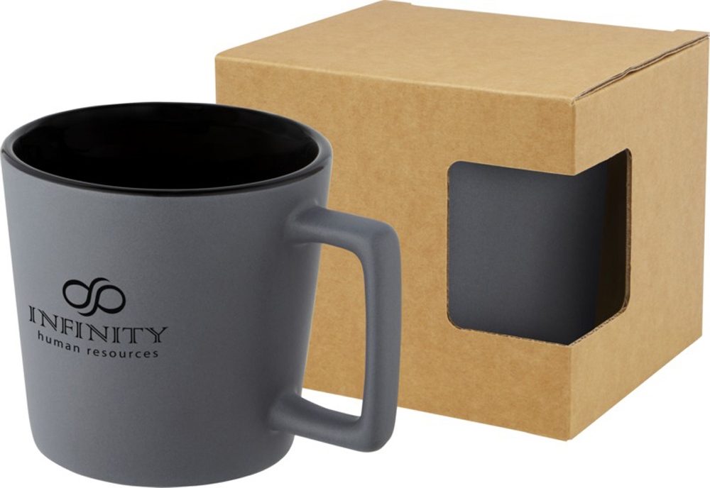 Керамическая кружка с современным дизайном и матовой отделкой. Объем 370 мл. Можно мыть в посудомоечной машине (все способы декорирования). Поставляется в подарочной коробке из переработанного картона. Керамика. Тампопечать (1 цвет (цветные изделия)) на данный товар осуществляется бесплатно. Оплачивается только настройка оборудования в размере 4000 рублей на весь тираж.