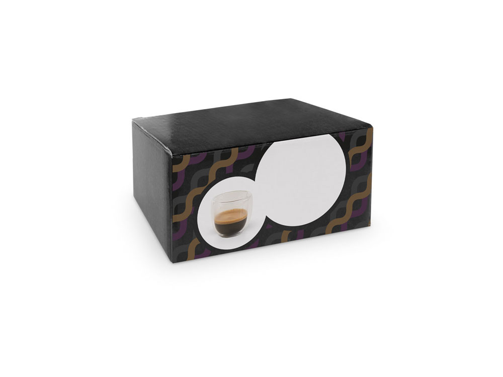 Кофейный набор из стекла с двумя изотермическими чашками с двойным корпусом емкостью до 75 мл. Поставляется в персонализируемой подарочной коробке. Коробка: 133 x 65 x 65 мм. Вид нанесения, рекомендуемый поставщиком: тампопечать, трафаретная печать, низкотемпературный обжиг, пескоструйная обработка