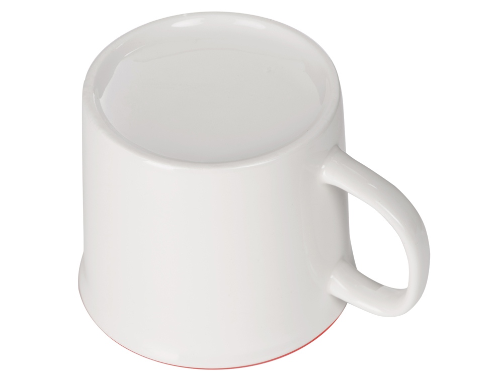 Кружка из костяного фарфора с выраженным рельефным ободком, окаймленным цветной контрастной полосой. Цвет полосы можно органично сочетать с цветом нанесенного логотипа, что придаст дизайну конечного продукта цельность облика.