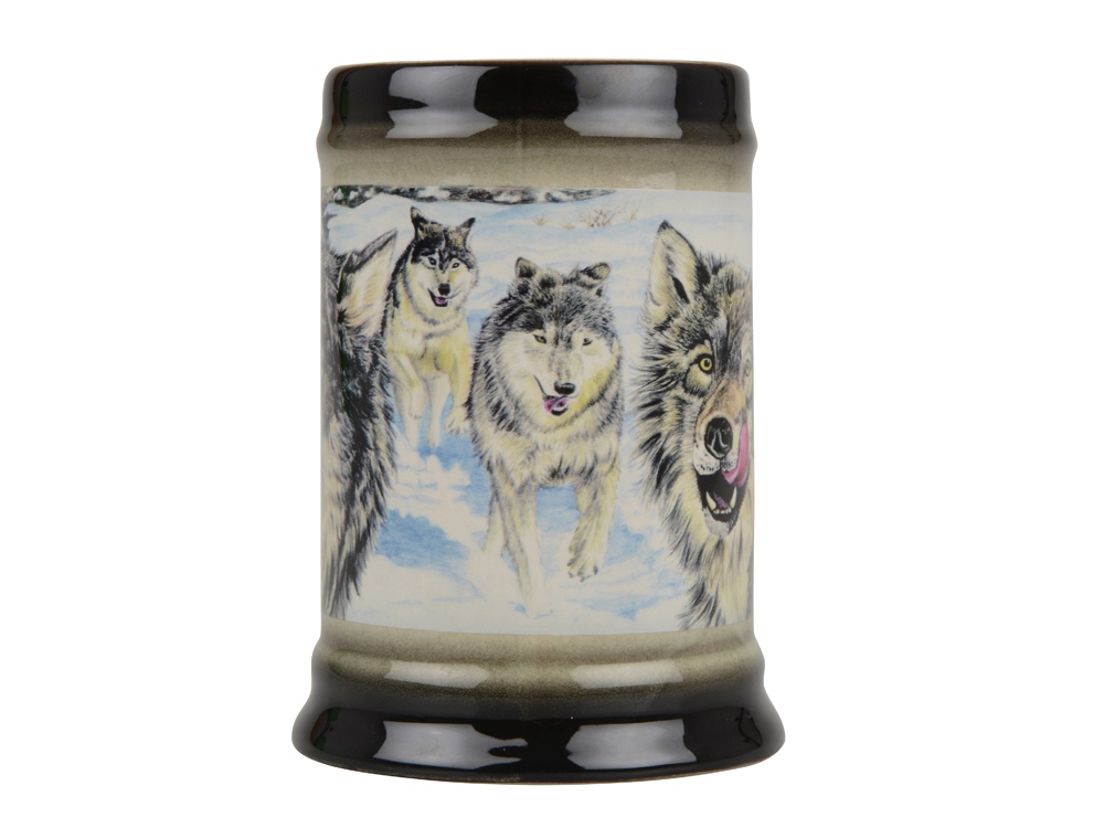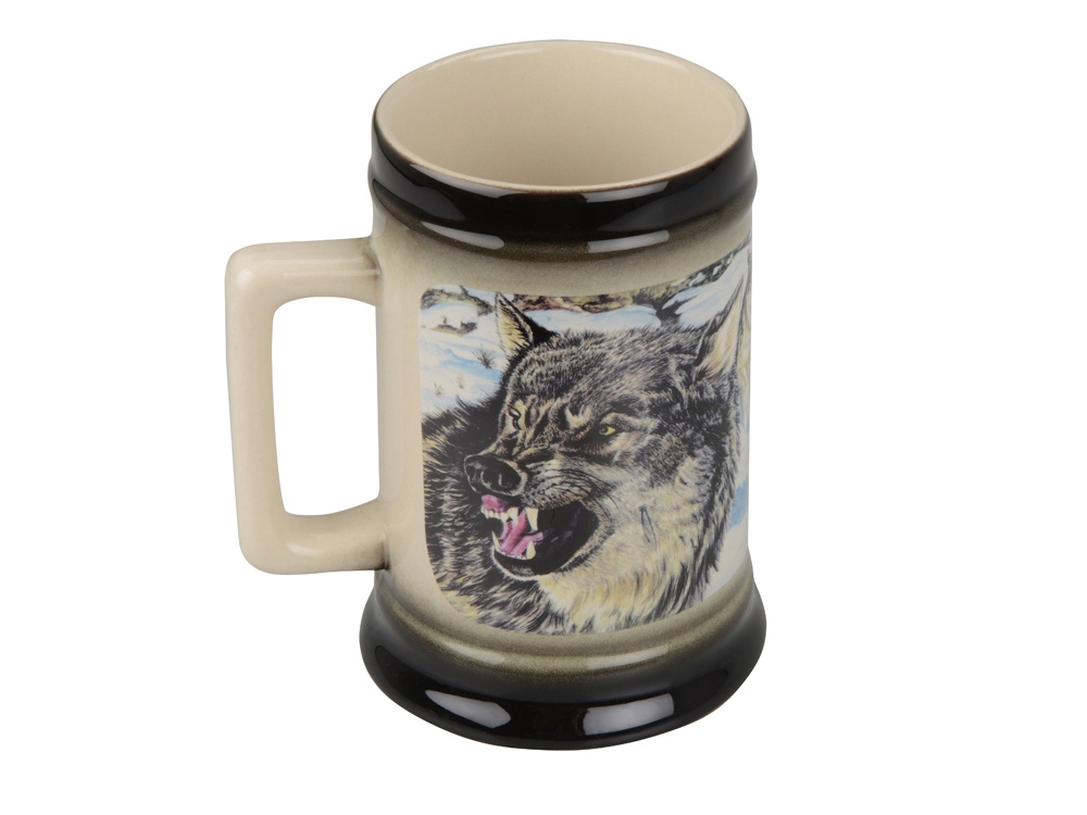 Тематическая кружка из высококачественной керамики хорошо подойдет на роль небольшого презента любителям охоты. Кружка украшена изображением санитара леса – волка. Кружка упакована в подарочную коробку бордового цвета.
