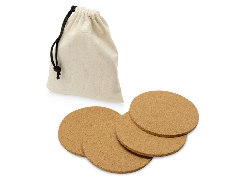 В набор входит 4 костера, упакованных в хлопковый мешочек на шнурке. И подставки, и упаковка набора выполнены из натуральных материалов, более того, хлопок для мешочка используется неокрашенный, что сокращает расход химикатов при создании ткани.