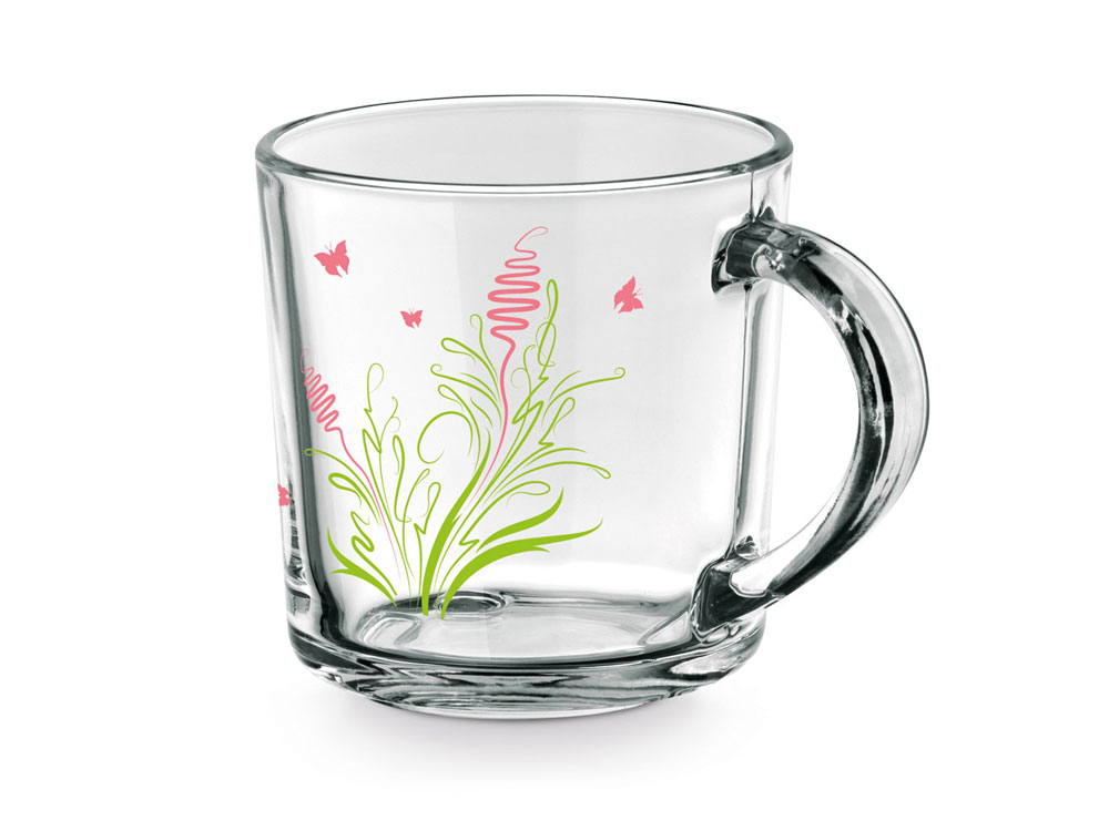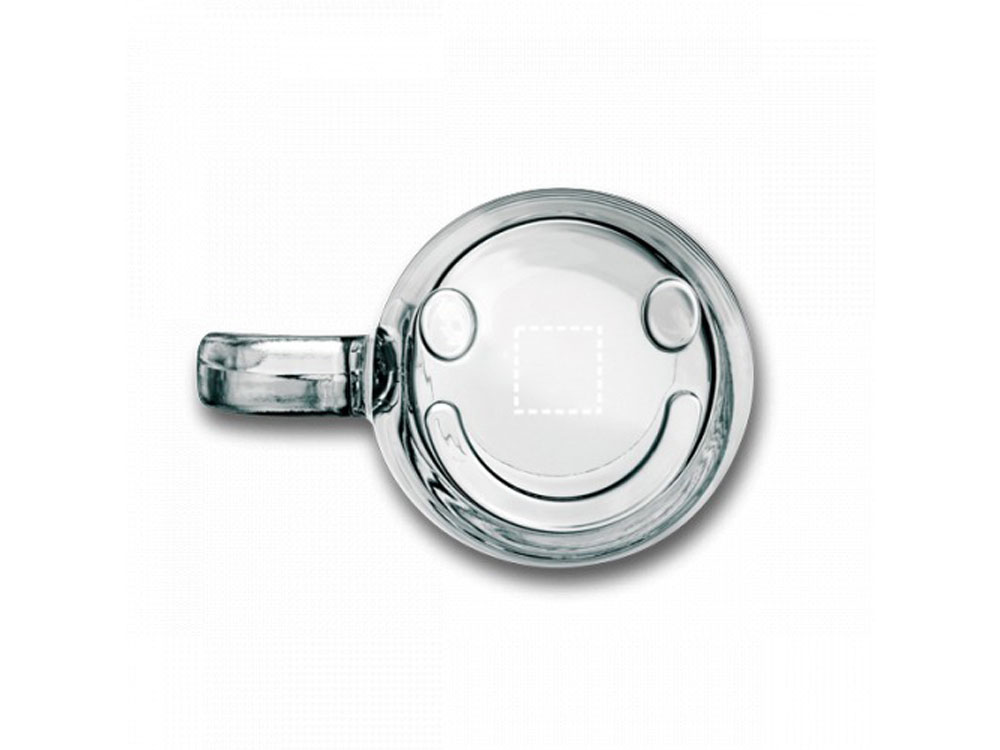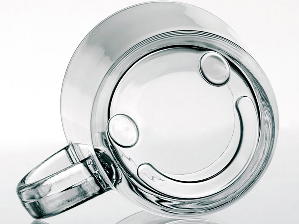 Стеклянная кружка со смайликом на дне, объем 280 мл. Вид нанесения, рекомендуемый поставщиком: тампопечать, низкотемпературный обжиг, высокотемпературный обжиг