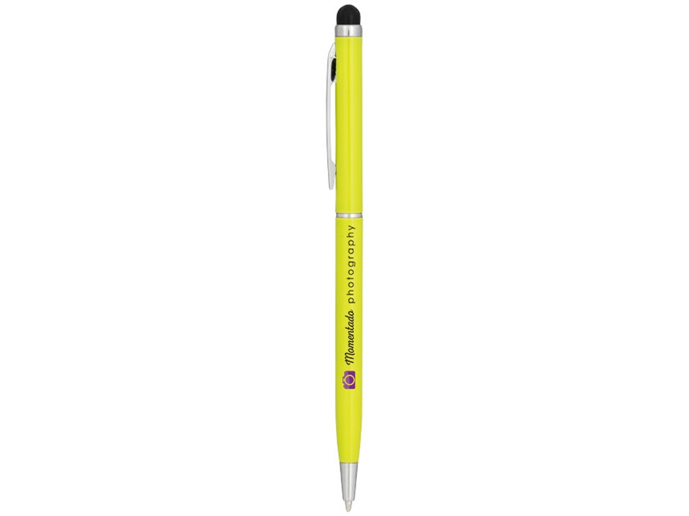 Алюминиевая шариковая ручка Joyce. Тонкая алюминиевая шариковая ручка с поворотным механизмом и стилусом. Алюминиевый корпус с металлическим зажимом и кольцом посередине, остальные элементы из пластика. Гравировка (оптоволоконный лазер) (Без чернения) на данный товар осуществляется бесплатно. Оплачивается только настройка оборудования в размере 1000 рублей на весь тираж.