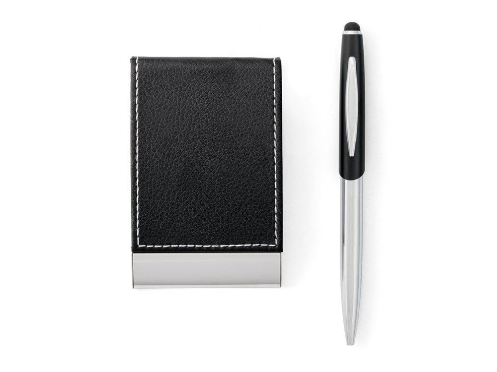 MURPHY. Набор ручка и держатель карты, Черный. Набор состоит из металлической ручки со стилусом и визитницы из металла и искусственной кожи. Данный набор поставляется в подарочной коробке. Вид нанесения, рекомендуемый поставщиком: гравировка, трансфер