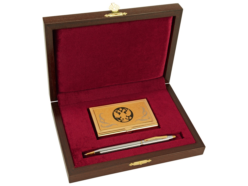 Отличный подарочный набор для руководителей, топ-менеджеров и ключевых клиентов. В набор входит визитница, шариковая ручка и небольшой подарочный футляр. Позолоченная визитница задекорирована изображением российского герба.
