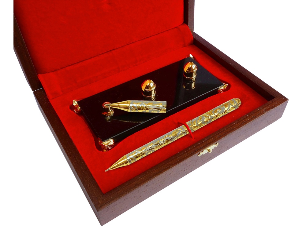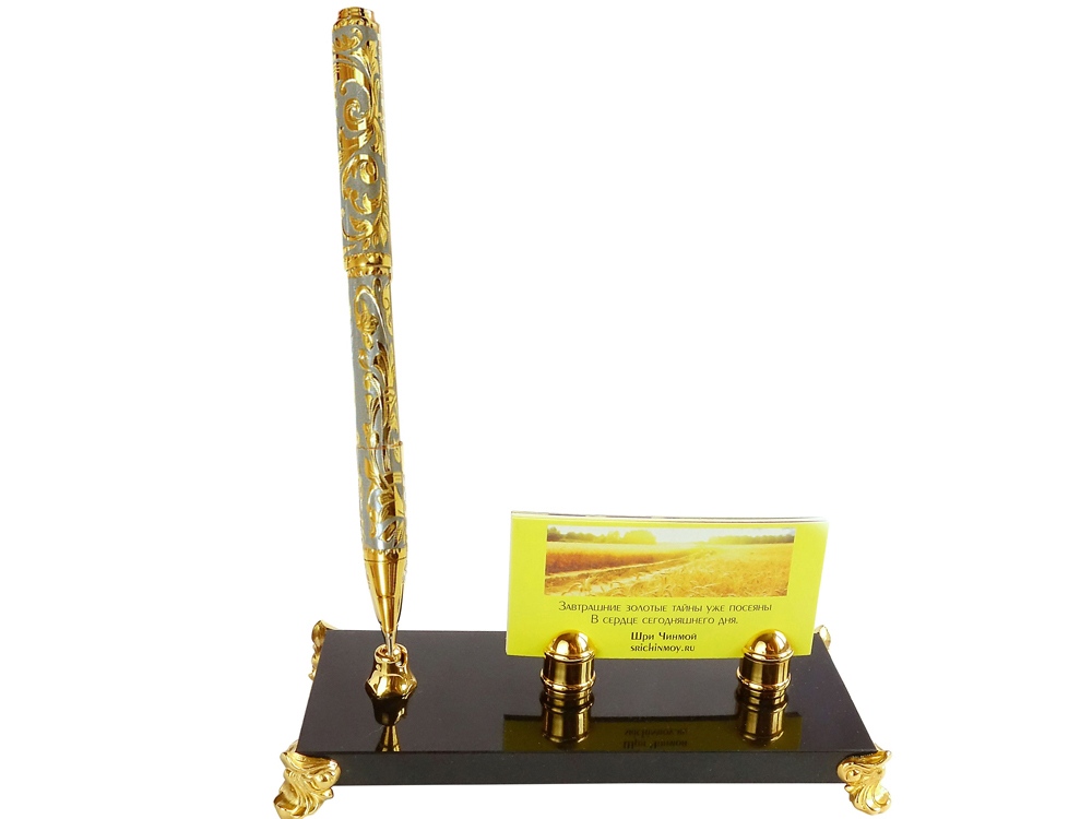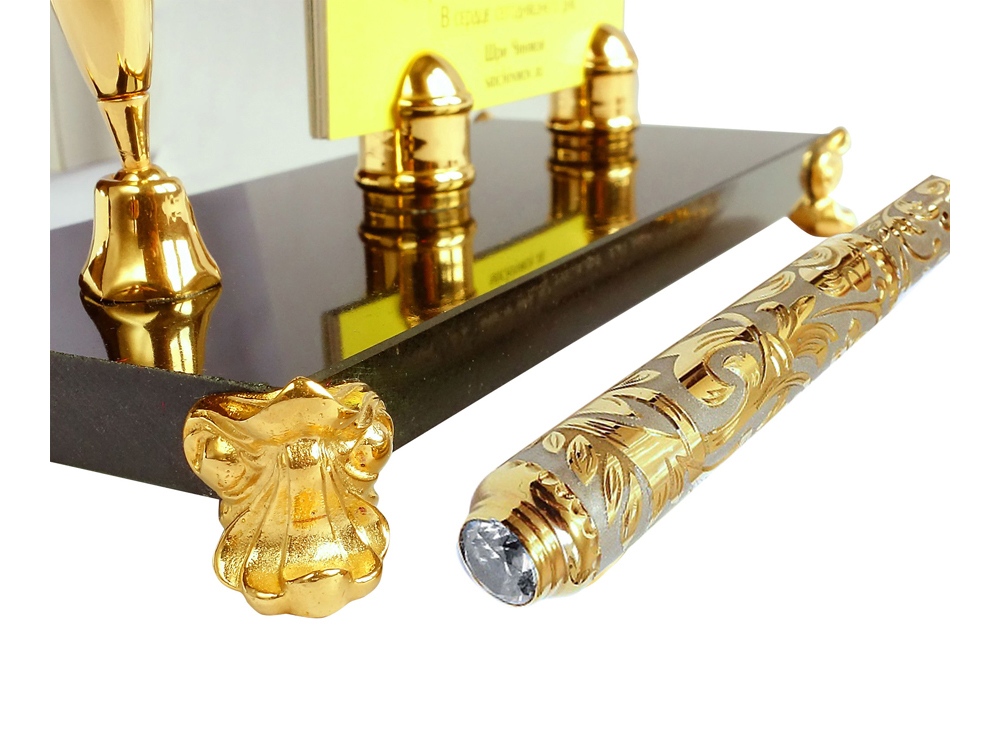 Оригинальная подставка под визитки с латунной ручкой покрытой золотом и никелем - это статусный подарок, который станет приятным сюрпризом как для рядового сотрудника, так и для руководителя. Стильный бизнес аксессуар подчеркнет внимание к деталям и поможет в формировании положительного впечатления о стабильности компании. Не будем скрывать, на любом рабочем столе такой прибор для письма с визитницей смотрится просто изумительно. Затейливые узоры на ручке привлекают внимание, а надежная подставка на небольших ножках уверенно держится на любом покрытии.