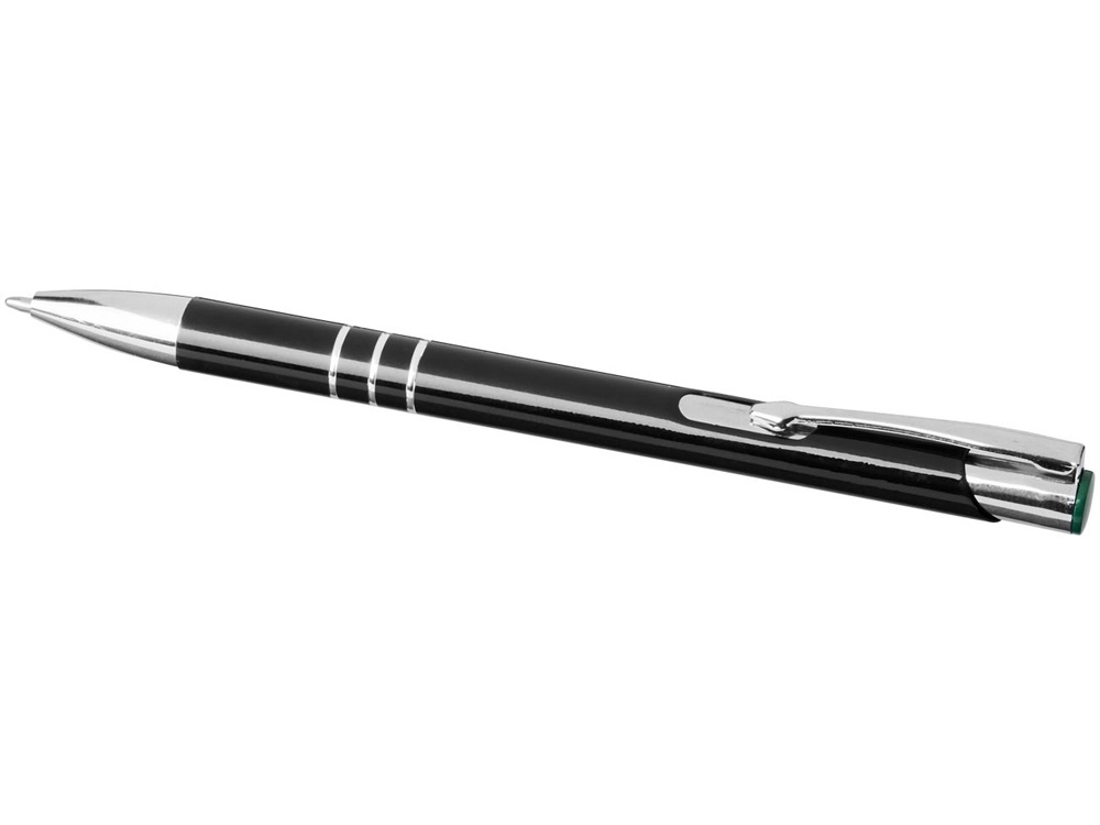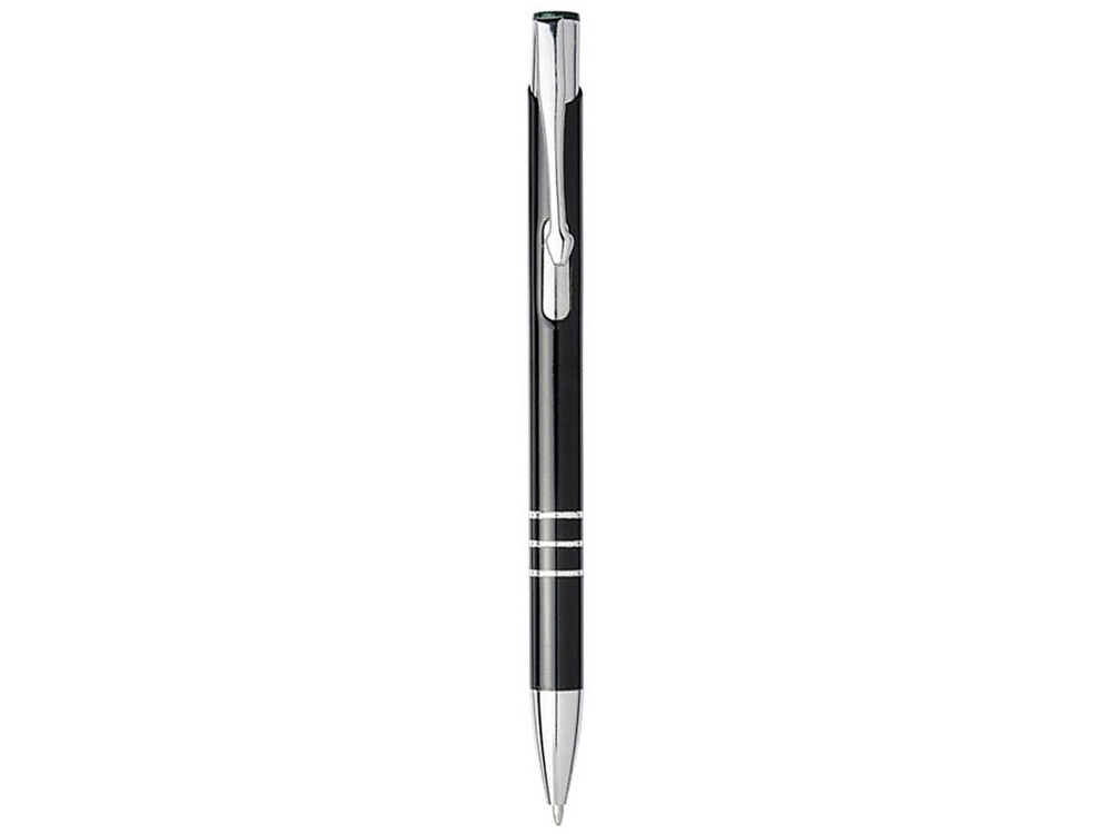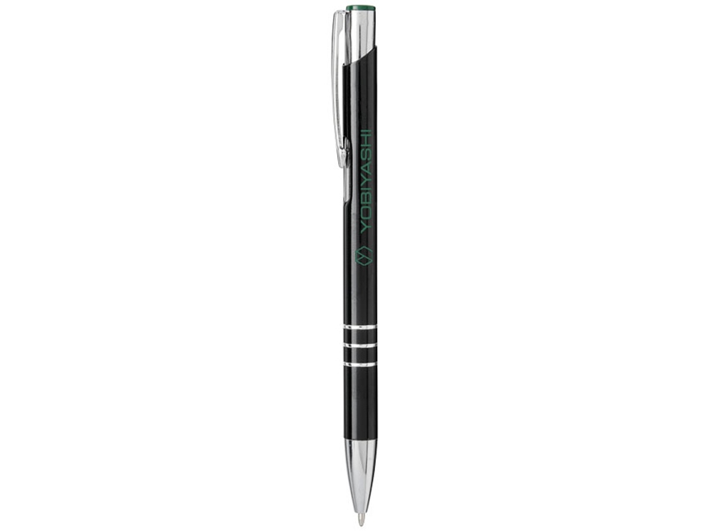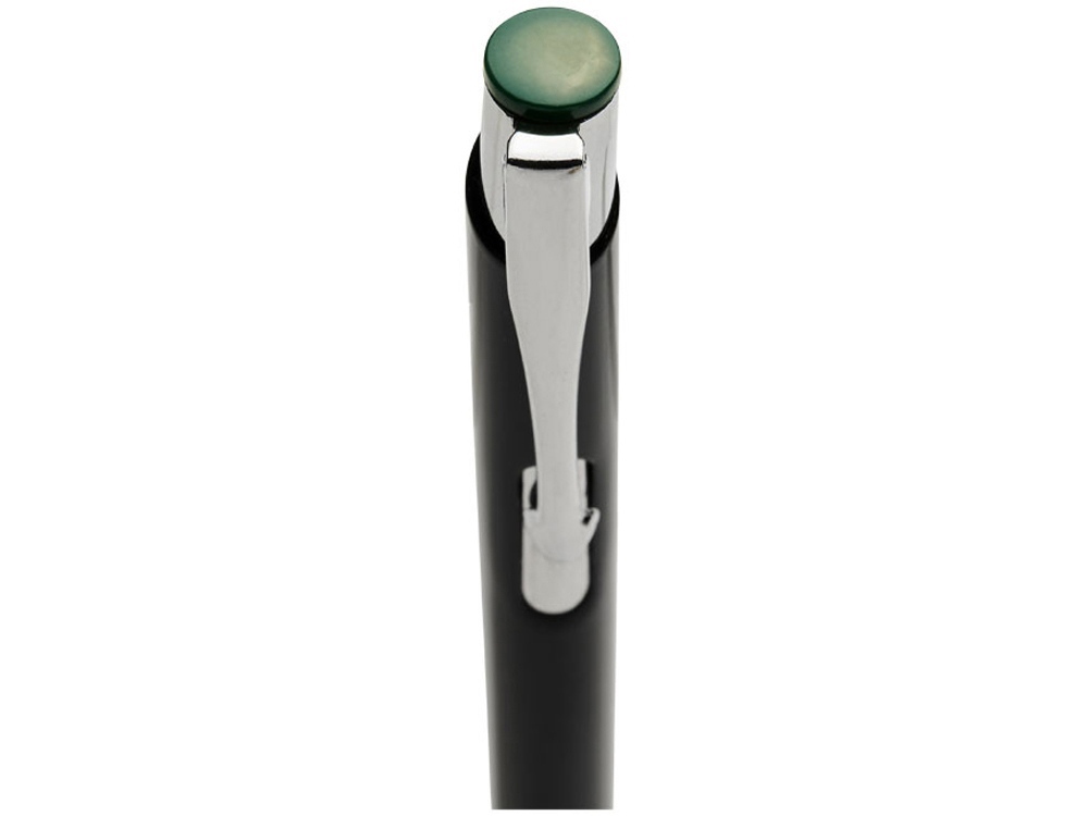 Черная шариковая ручка с кнопочным механизмом. Цвет кнопки совпадает с цветом гравировки.