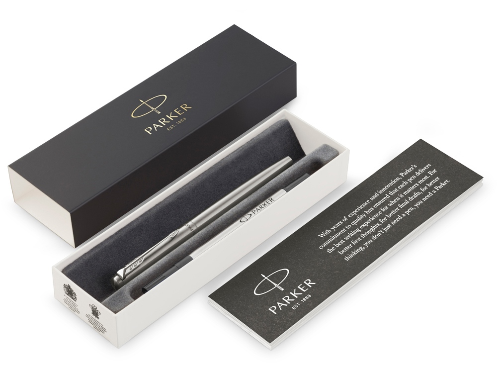 В 2019 году PARKER расширил коллекцию Jotter, добавив в нее ручки-роллеры, совмещающие в себе гладкость письма пера и повседневное удобство шариковой ручки. Баррель и колпачок ручки-роллера Parker Jotter Core 2019 Stainless Steel CT выполнен из полированной нержавеющей стали, грип-секция изготовлена из сверхпрочного пластика черного цвета. Гравировка (оптоволоконный лазер) (Без чернения) на данный товар осуществляется бесплатно. Оплачивается только настройка оборудования в размере 950 рублей на весь тираж.
