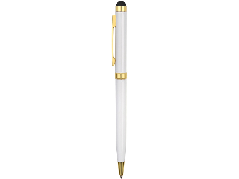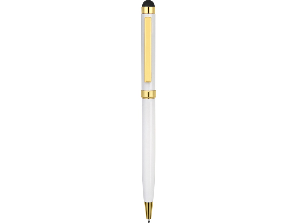 Стильная металлическая ручка со стилусом Голд Сойер – по-настоящему универсальный пишущий инструмент. Ею можно делать записи на бумаге, а перевернув, работать с емкостными экранами с помощью стилуса. Элегантность ручки подчеркивают позолоченные детали: клип, носик и кольцо.