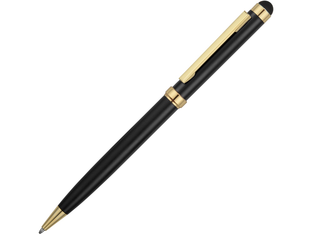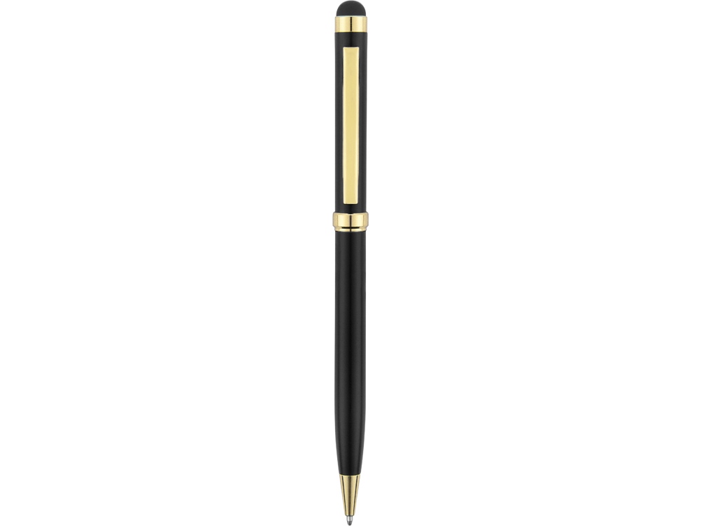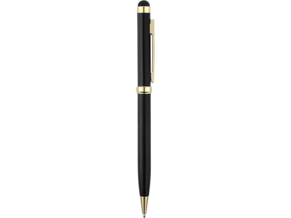 Стильная металлическая ручка со стилусом Голд Сойер – по-настоящему универсальный пишущий инструмент. Ею можно делать записи на бумаге, а перевернув, работать с емкостными экранами с помощью стилуса. Элегантность ручки подчеркивают позолоченные детали: клип, носик и кольцо.