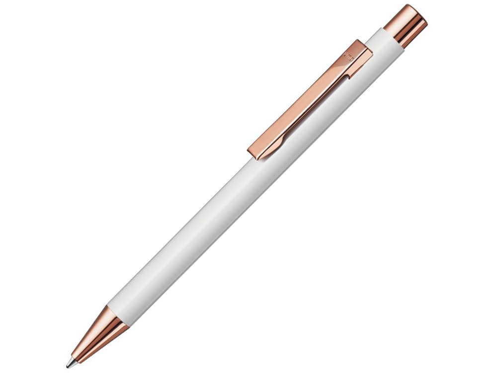 Металлическая шариковая ручка с корпусом в белом глянцевом цвете, металлическим наконечником, металлическим клипом и кнопкой с глянцевой розово-золотой отделкой.