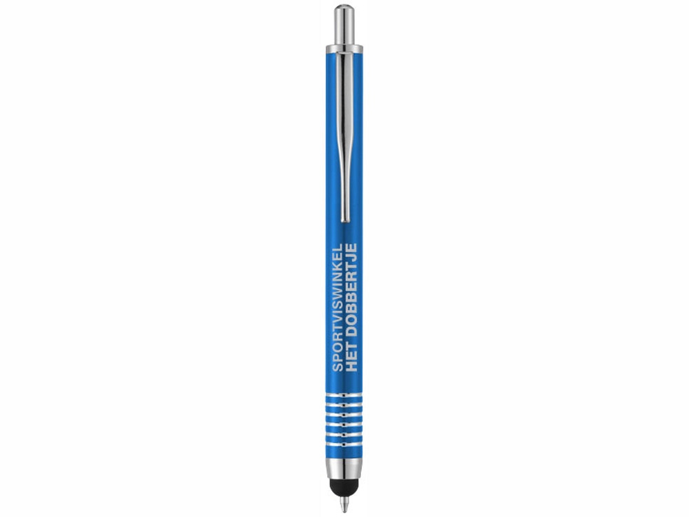 Шариковая ручка-стилус Zoe. Шариковая ручка-стилус с кнопочным механизмом. Алюминий. Гравировка (оптоволоконный лазер) (Без чернения) на данный товар осуществляется бесплатно. Оплачивается только настройка оборудования в размере 950 рублей на весь тираж.