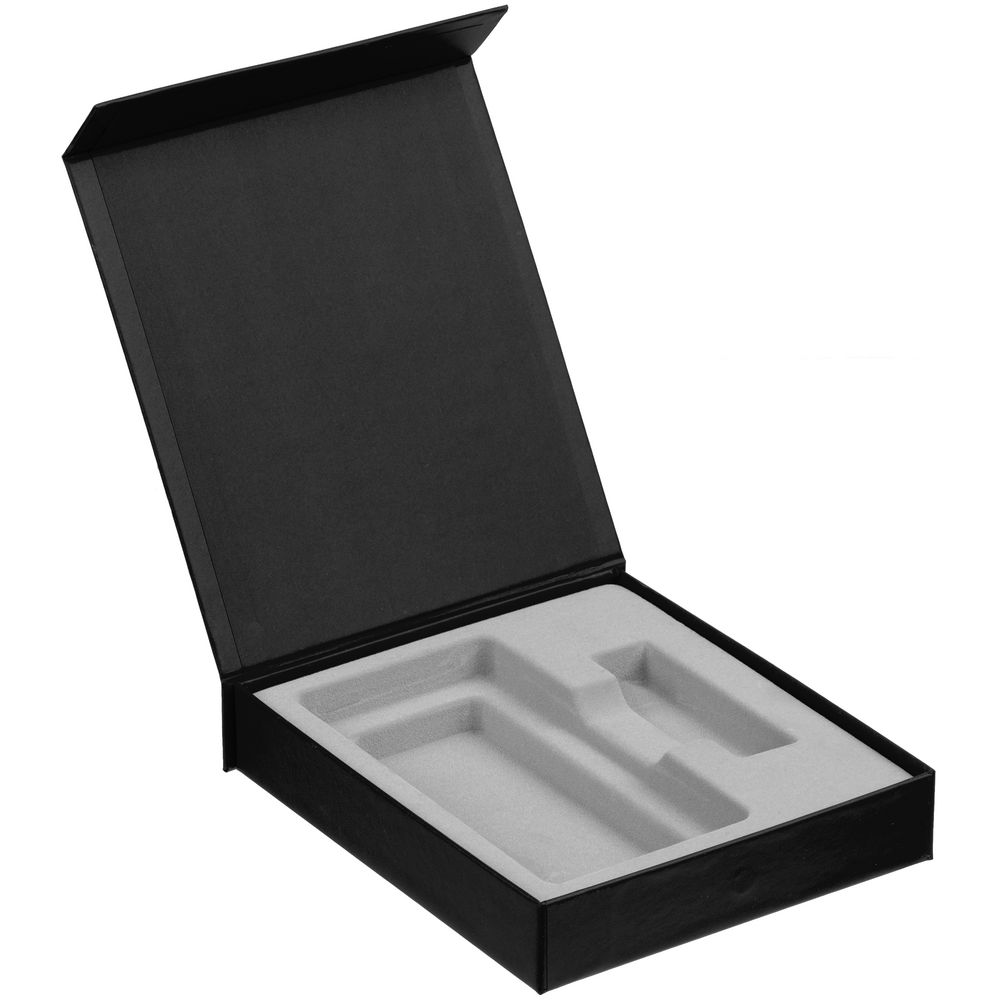Подарочная коробка для аккумулятора 14,6х7,5х1,3 см и флешки 8,2х2,2х1,2 см с крышкой на магните и флокированным ложементом.