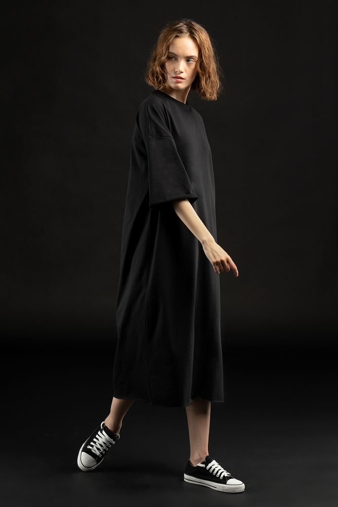 Платье свободного кроя со спущенным плечом.